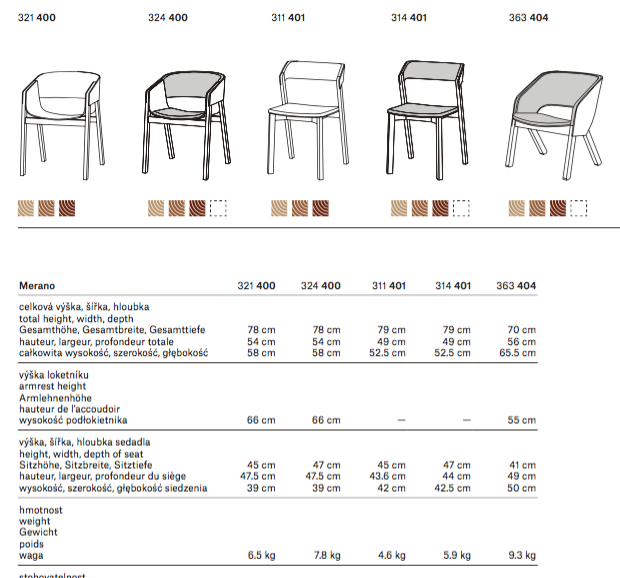 Merano chair combines solid wood lower structure with harmonic curves of molded plywood seat and armrests. Thanks to used production technology, the chair is very light and does not have any screws or metal parts. It is offered in upholstered version, it is stackable and can be fitted with fittings for joining in lines. When using a cart, up to 14 plain chairs can be stacked together. The Merano collection includes an armchair, a lounge chair and a barstool.