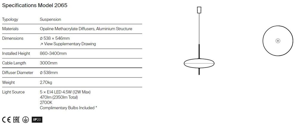 Model 2065 consists of a diffuser made up of two opalescent plates joined and suspended from the ceiling with a black painted aluminum rosette. A simple design played on the elliptical shape and the lightness of the materials which, together, seem to give life to a weightless creation. The lamp was relaunched by Astep in 2016 also in a second black version, in which the upper plate is finished with a soft-touch coating with a strong graphic expression. Five E14 LED bulbs provide illumination in all versions of the lamp.