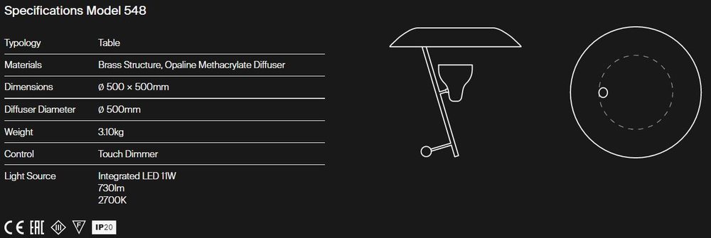In the re-issue, the original incandescent bulb has been replaced by an LED source, and an optical dimmer switch has been integrated discreetly into the original design.