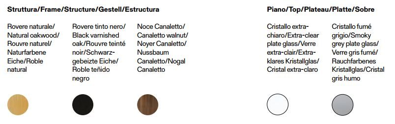 Frame in solid natural or black varnished oak, or in solid natural Canaletto walnut; wax-finished varnish. Extra clear plate glasstop, with inclined cut edges, or smoky grey plate glass top, with inclined cut edges, matching the black oak frame