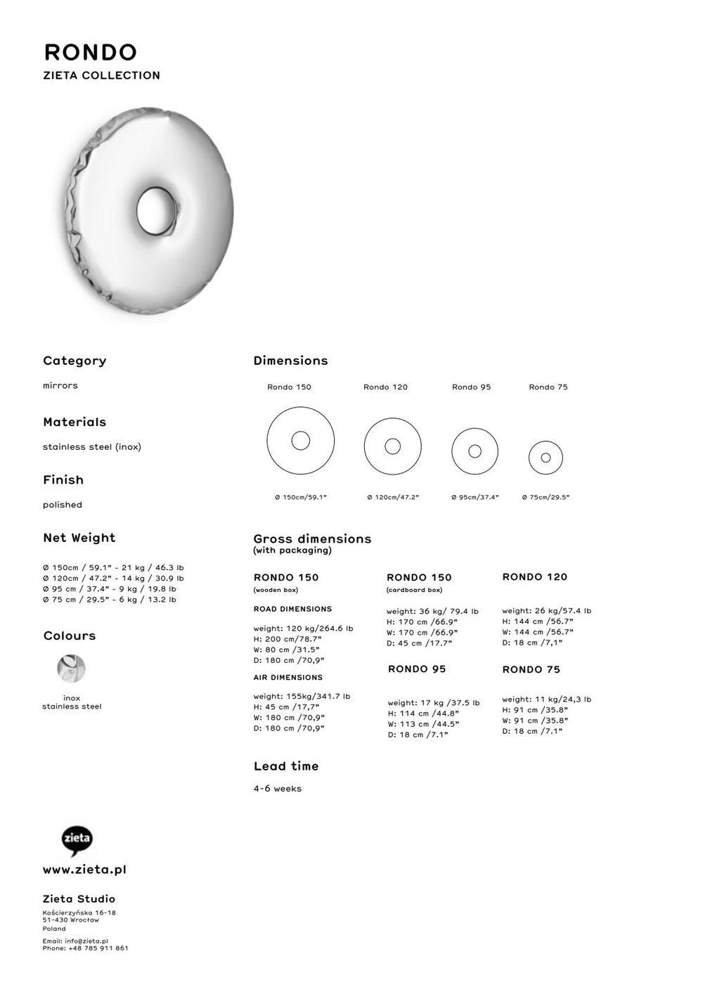 Zieta Studio creates objects, or as we like to call them, mirror-like sculptures. RONDO is a regular tribute to Oskar Zięta’s original method of metal manufacturing. To illustrate it simply, imagine two sheets of full-circle skirt patterns made from stainless steel. These two elements are precisely and tightly welded together, then inflated with high-pressure air into a three-dimensional object. This volumetric expansion, often called the “controlled loss of control,” is a manifesto of advanced parametric programming and the free deformation process of the material. This convex freedom leads to unique deformations at the edges, which refract light and create an unparalleled impression of softness.