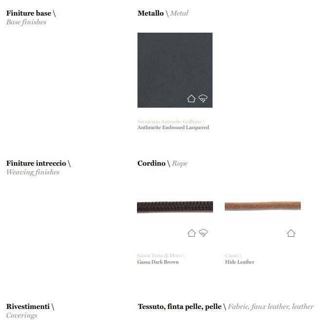 From exotic remembrances, Ropu stands out for its sophisticated woven border in hide rope, running along the perimeter structure creating a frame for marble, back-painted tempered glass, laminated porcelain and HPL tops or soft cushions with mousetail cord profiles.