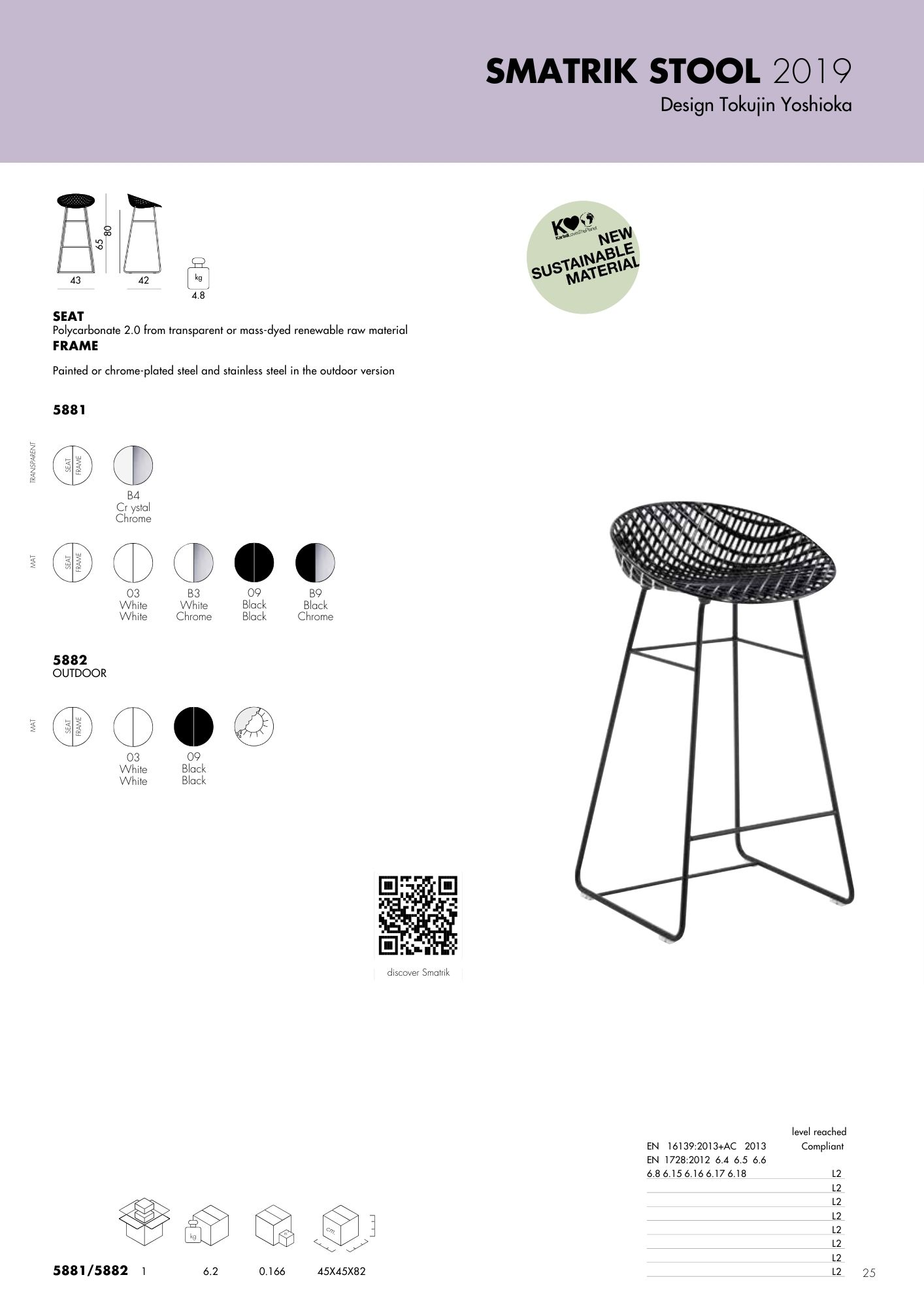 The brand-new stool joins the family of seats created by Tokujin Yoshioka and is crafted using a mould which enables the recreation of a 3D net that overlaps and crosses over.Thanks to a special injection technology, the layers of transparent or mass-dyed polycarbonate create a structure moulded in a single piece, which simulates a metallic net, with a painted or chrome-plated structure, painted with stainless steel for the outdoor version. Available in the following colour/structure combinations: crystal/chrome, white/white, white/chrome, black/black, black/chrome in the indoor versions and white/white, black/black in the outdoor versions.