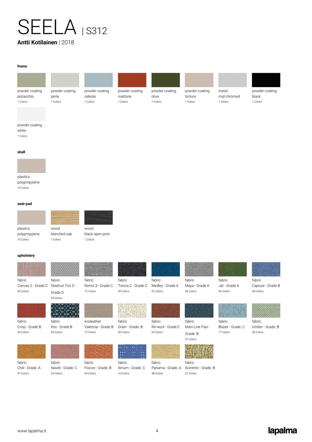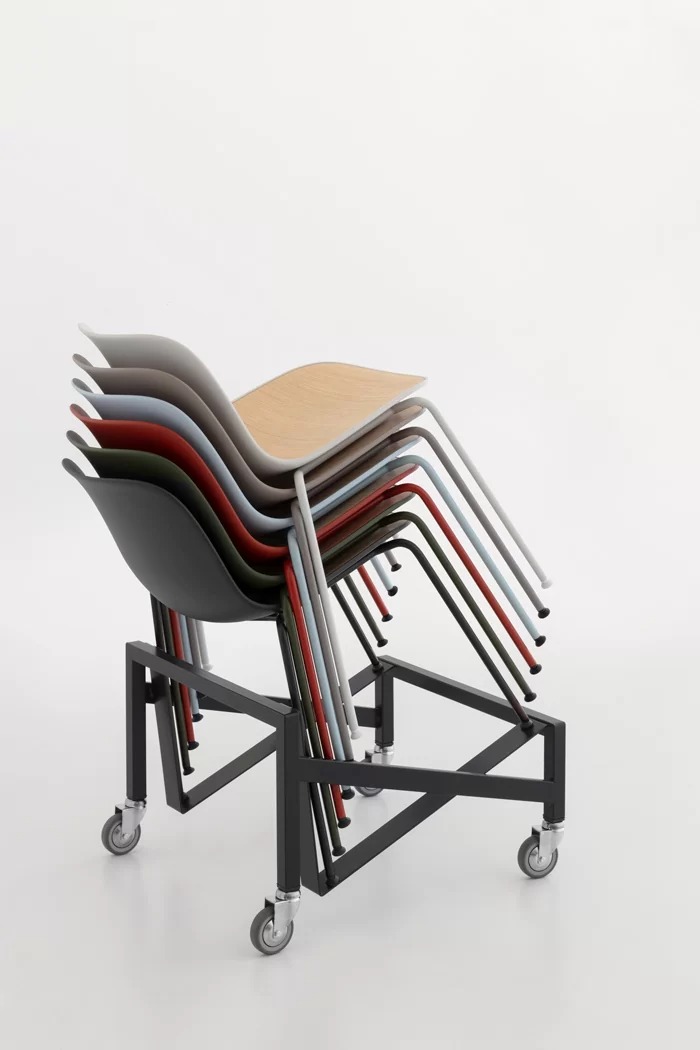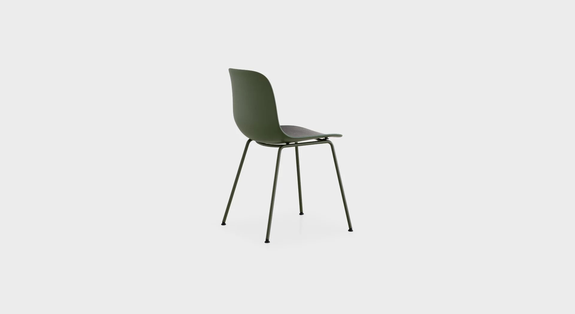 The shell is made of polypropylene, with an integrated seamless seat pad in polypropylene, wood, or fabric, which can be easily removed with four screws and replaced. A fully upholstered shell without a removable seat pad is also available.