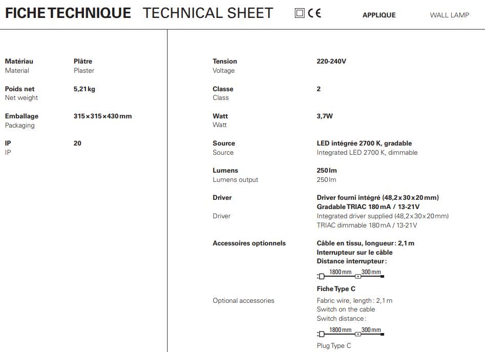 The SOUL collection includes 5 white plaster lights with or without gold leaf decoration and a corner sconce for hallway lighting. Weighing between 3.7 and 5.2 kilos, the Soul lights are equipped with integrated LED lighting.