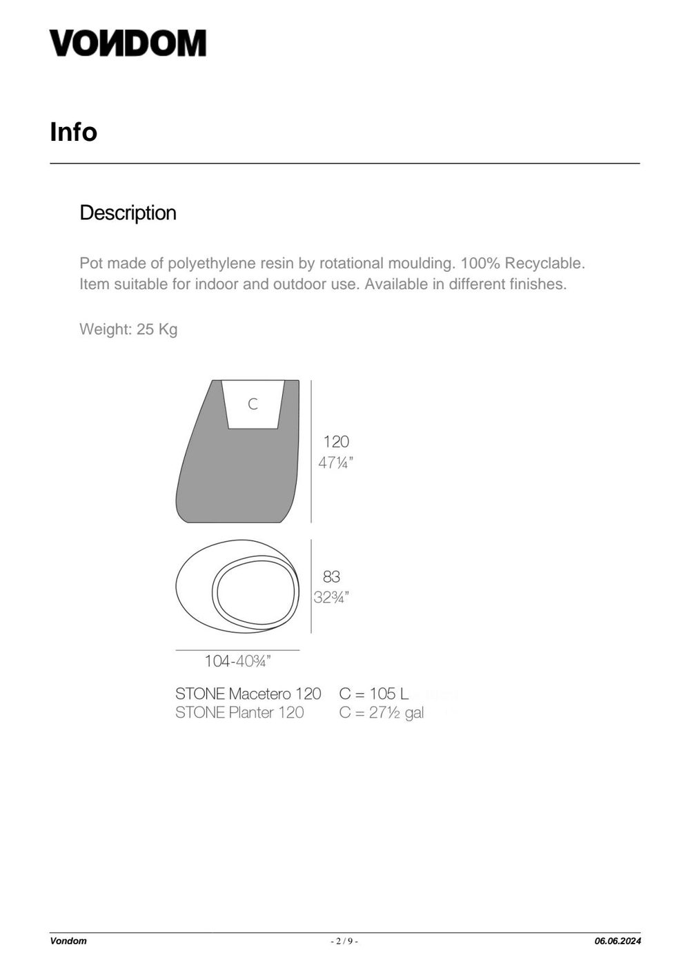 Pot made of polyethylene resin by rotational moulding. 100% Recyclable. Item suitable for indoor and outdoor use. Available in different finishes.