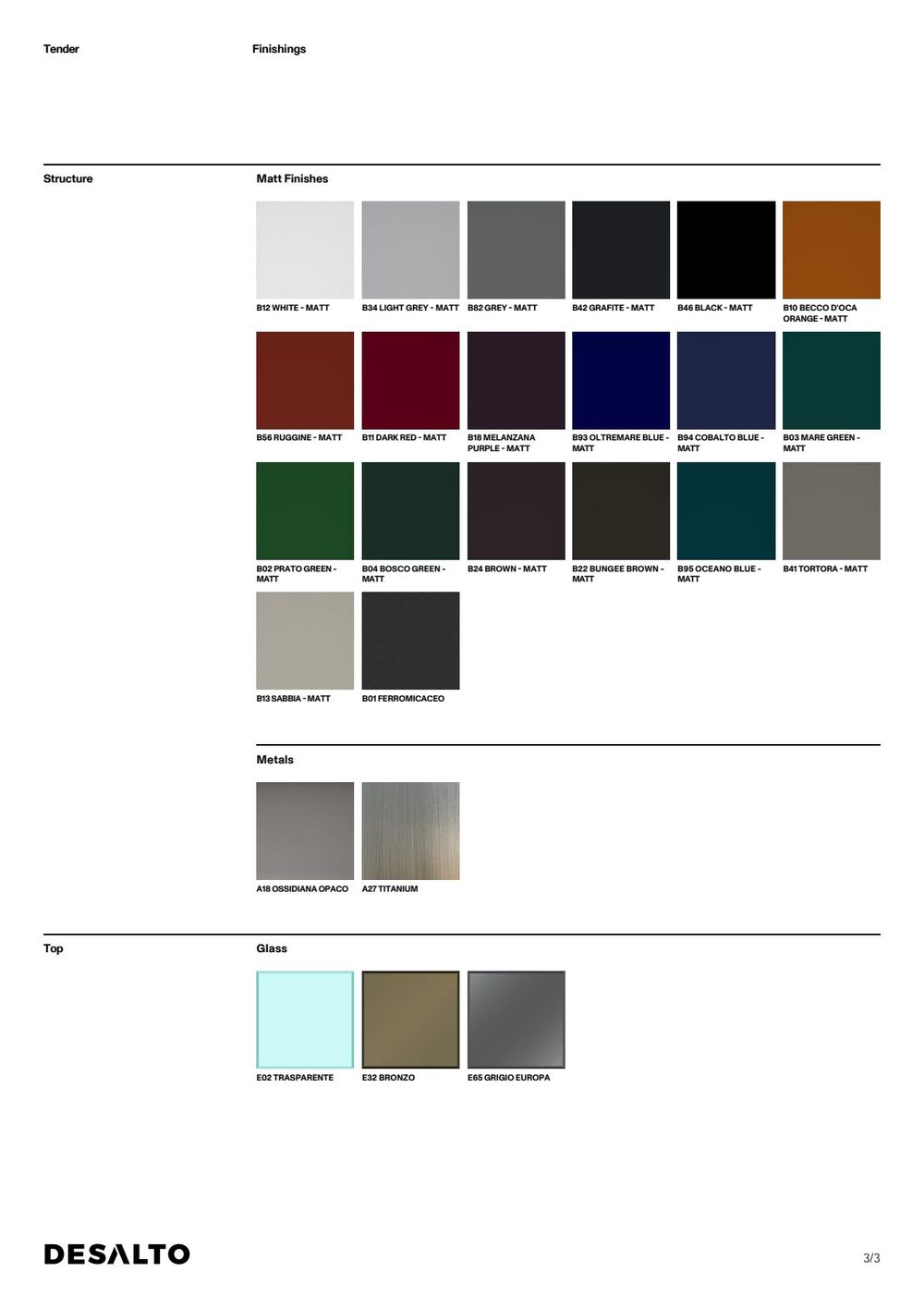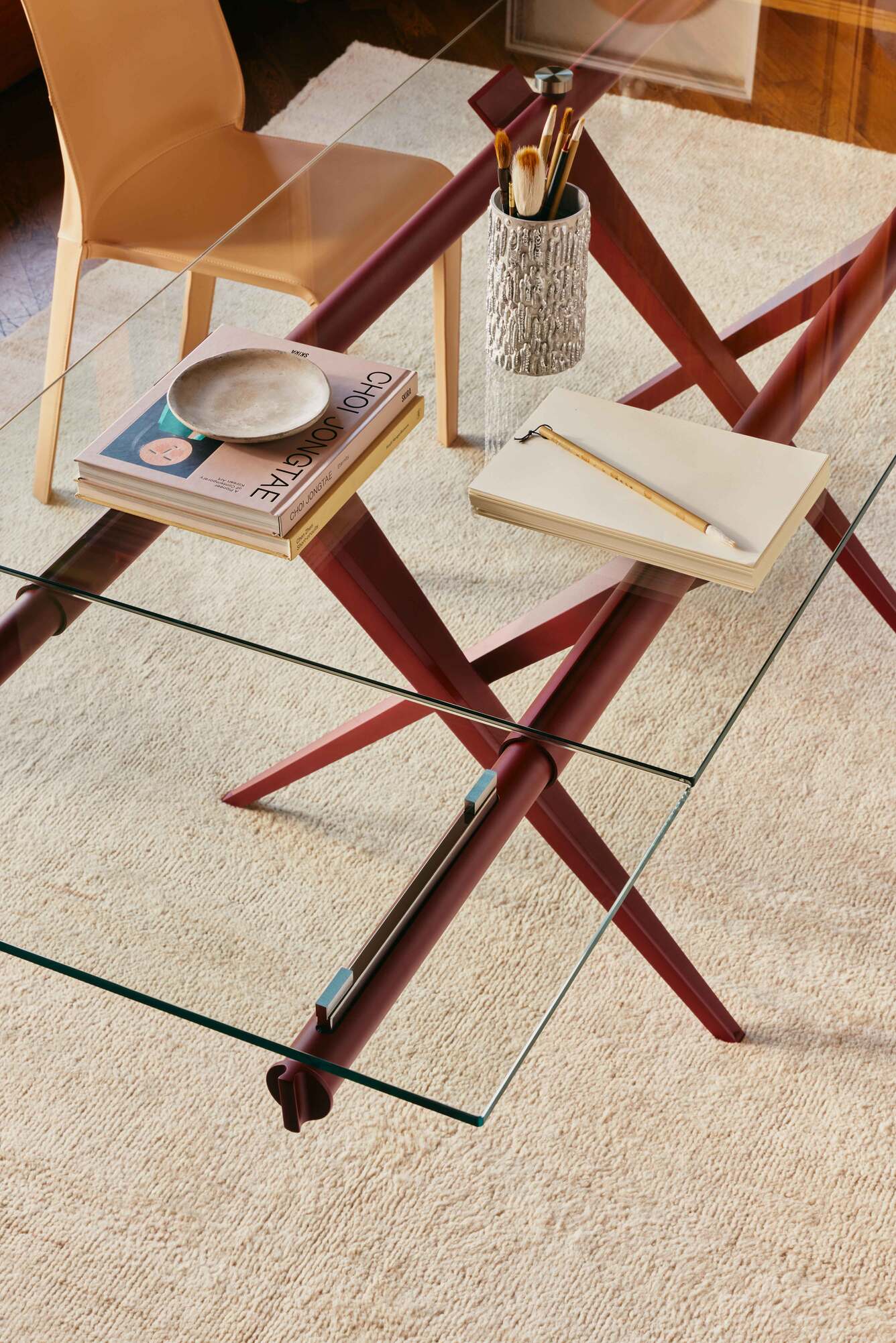 The introduction of color in Tender’s lacquered frame completely transforms the perception of the product. The new finishes bring freshness and modernity, updating the historic design and giving the table a new life. The tones highlight the essential forms, enhance the lightness of the glass top, and make Tender an even more contemporary and distinctive design object.