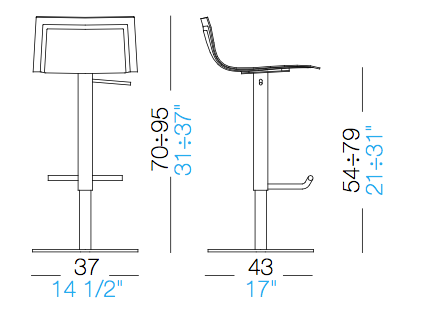 Stool with swivel seat and adjustable height with gas-spring. Leg in sandblasted stainless steel, base zinc-plated and covered with a stainless steel sheet. Seat in curved plywood with thickness variation, thinner on the edge.'