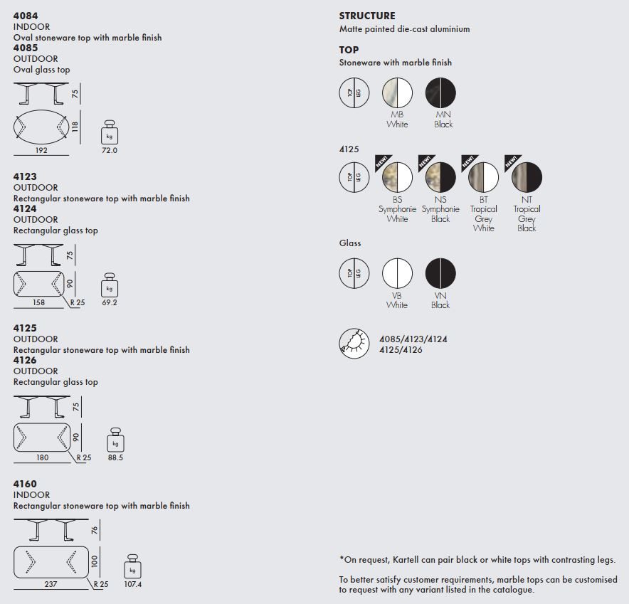 Antonio Citterio has created a family of tables : Multiplo.This project's unique charachter lies in the concept that you can give tables a completely different appearance by simply changing the colour and pattern of their surface.The stucture beneath is made from plastic with different bases ,and the top itself is formed from extremely sleek ceramic.The table's leg are constructed using thermoplastic technopolymer that has been moulded to bear the table's weight, while the ceramic top is mass-coloured or features a marble effect.From the minimalist to the decorative ,from pop art to more elegant designs,from bourgeois dining table to the perfect bar tables for contract furniture, Multiplo bears witness to this eclectic and versatile spirit.