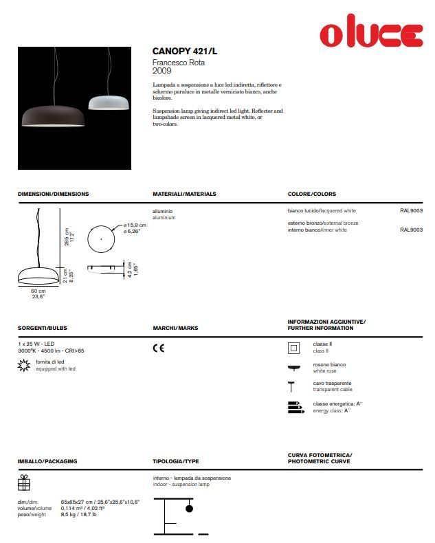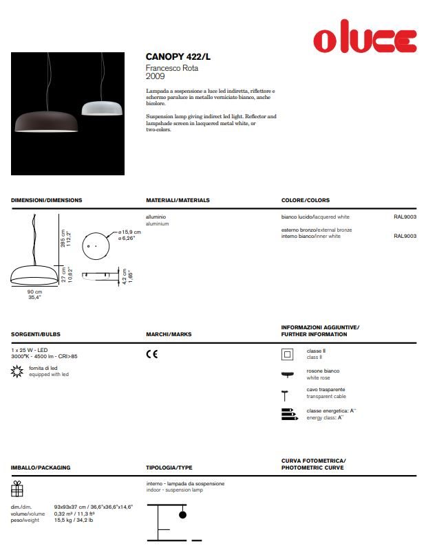 Canopy owes both its shape and its name to the ceiling rose, one of the simplest and often neglected elements of lighting technology, used to conceal the wires coming out of the ceiling. Francesco Rota takes up this shape again but this time he enlarges, ennobles and makes it the focal point of the project, a large-sized metal lampshade, proposed in sought-after colour combinations. Inside the dome, a particular source of light has been inserted, the circline bulb, capable of diffusing a soft, sinuous light into the surrounding environment.